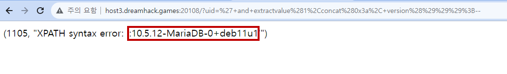입력값에 위 payload 입력시 : 뒤에 DB 서버 버전 정보가 노출됨을 알 수 있다.
